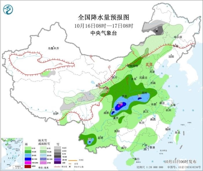 10月16日08時(shí)至17日08時(shí),內(nèi)蒙古東部、黑龍江西部、吉林西部、甘肅西南部、青海東部和南部、西藏東北部等地部分地區(qū)有小到中雪或雨夾雪,內(nèi)蒙古東北部等地部分地區(qū)有大雪;四川盆地東部、西北地區(qū)東部、黃淮西部、江漢西部和北部、云南西南部等地部分地區(qū)有中到大雨,其中,陜西南部、四川東北部、重慶西北部、河南西南部等地部分地區(qū)有暴雨或大暴雨(100~120毫米)。新疆南疆盆地、內(nèi)蒙古中西部、西北地區(qū)東部等地部分地區(qū)有4~6級(jí)風(fēng)。