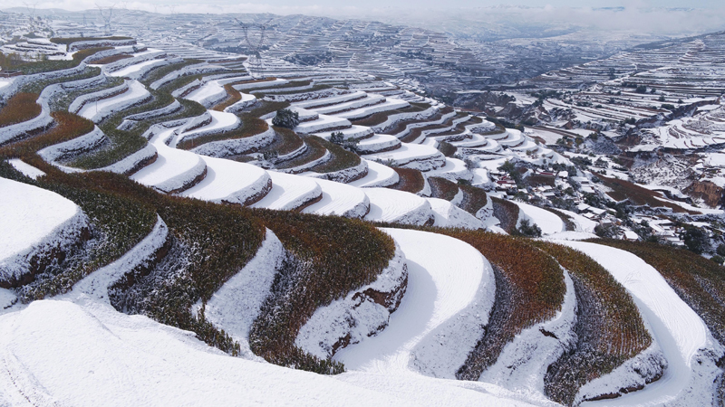 這是10月17日在甘肅永靖縣陳井鎮(zhèn)拍攝的雪后梯田(無人機(jī)照片)。