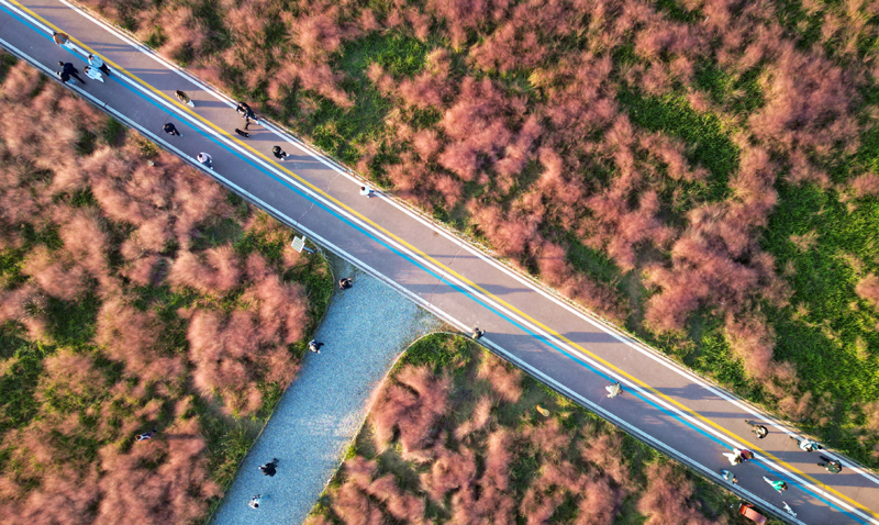 10月18日,游客在山東省東營(yíng)市東營(yíng)區(qū)耿井濕地粉黛亂子草“花海”拍照打卡(無人機(jī)照片)。