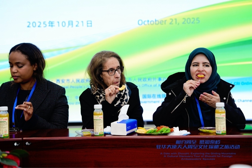 駐華大使夫人品嘗著不同品種的獼猴桃以及各式各樣的獼猴桃深加工食品,紛紛稱贊其細(xì)膩的口感、獨(dú)特的風(fēng)味和濃郁的果香?!斑@不僅是一次味覺(jué)的享受,更是一次對(duì)中國(guó)鄉(xiāng)村產(chǎn)業(yè)振興的直觀感受?!蹦β甯珩v華大使夫人表示,“我非常期待后續(xù)可以和周至合作,因?yàn)槟β甯绾芟矚g這種水果,我也希望可以在這里學(xué)到一些產(chǎn)業(yè)發(fā)展的知識(shí),并把這些知識(shí)帶回我們國(guó)家?!?/p>