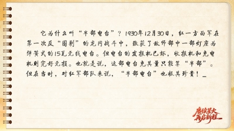 在第二次反“圍剿”的關(guān)鍵時刻,當時擔(dān)任無線電隊隊長的王諍帶領(lǐng)無線電隊,利用這“半部電臺”日夜不間斷地監(jiān)聽、捕捉敵人的電臺信息,最終幫助紅軍取得了第二次反“圍剿”的首戰(zhàn)勝利。