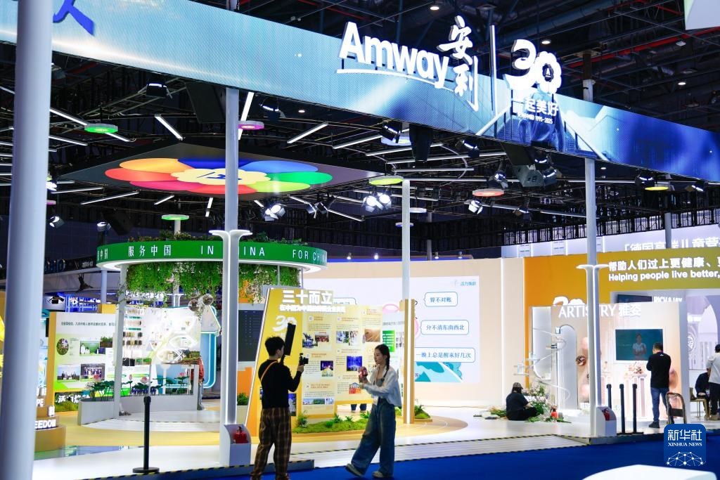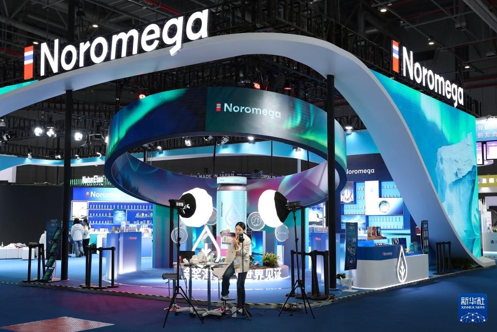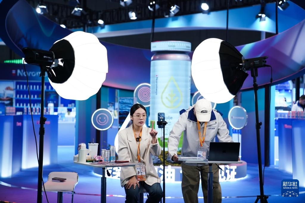 11月4日,工作人員在第八屆進(jìn)博會的一個展位前錄制視頻。