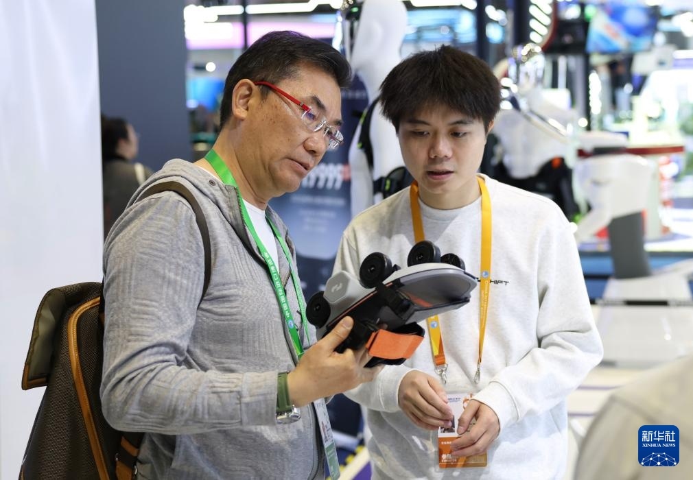 11月6日,在進(jìn)博會(huì)創(chuàng)新孵化專區(qū)瞬動(dòng)科技展臺(tái),一名展商(右)向參觀者介紹其全球首發(fā)的踏月者Air輪式外骨骼。