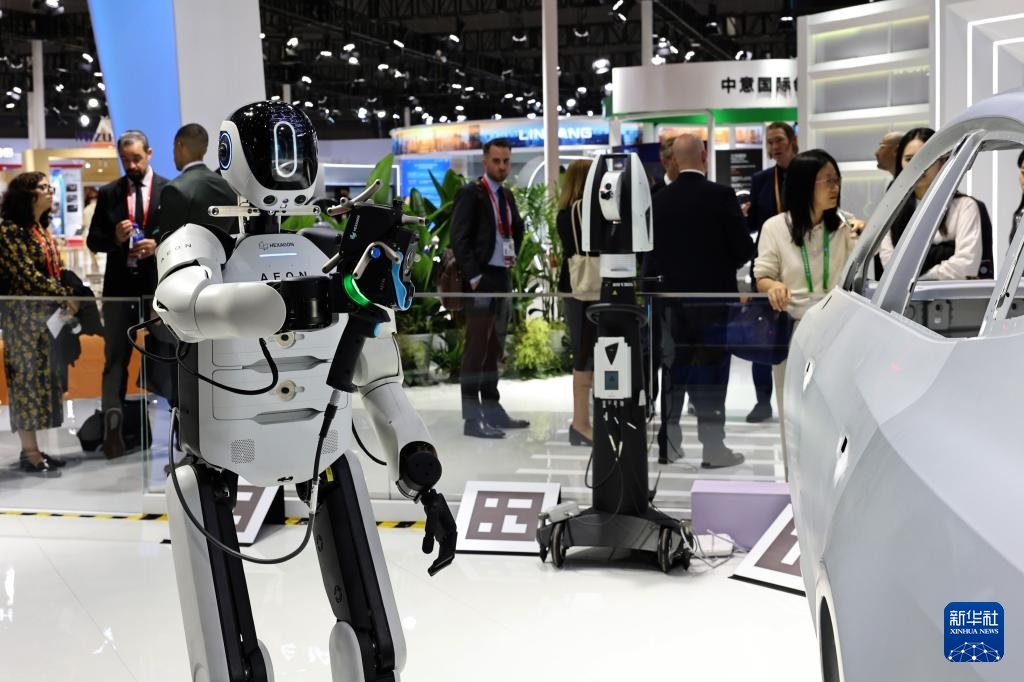 11月5日,一個(gè)??怂箍礎(chǔ)EON工業(yè)人形機(jī)器人在展臺(tái)上進(jìn)行三維掃描作業(yè)演示,這也是該型號(hào)機(jī)器人工業(yè)自動(dòng)化應(yīng)用場(chǎng)景的中國(guó)首展。