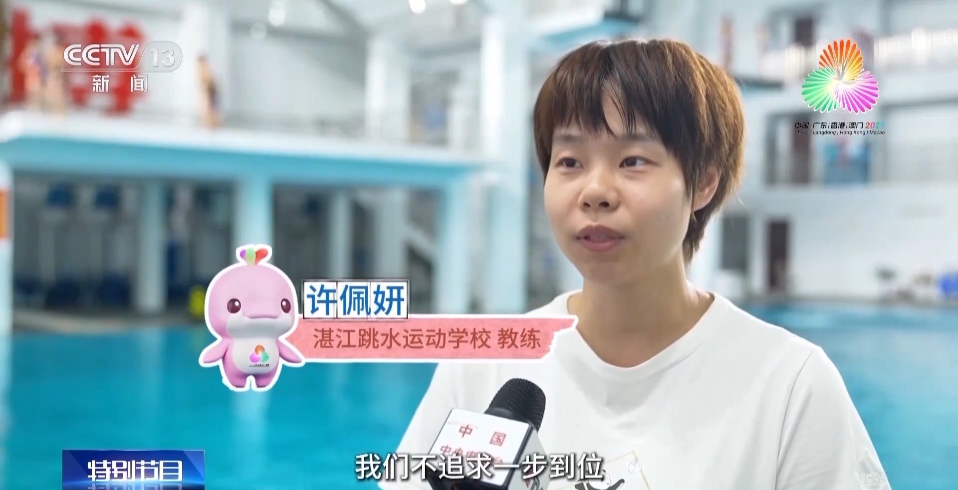 湛江跳水運(yùn)動(dòng)學(xué)校教練 許佩妍:我們不追求一步到位,因?yàn)槲覀兒芏嗪⒆佣际呛_呴L(zhǎng)大的,喜歡追波逐浪,那么他們來了以后,我們先讓他們愛上水,愛上跳躍,正是這份興趣成為他們成長(zhǎng)最大的基礎(chǔ)。
