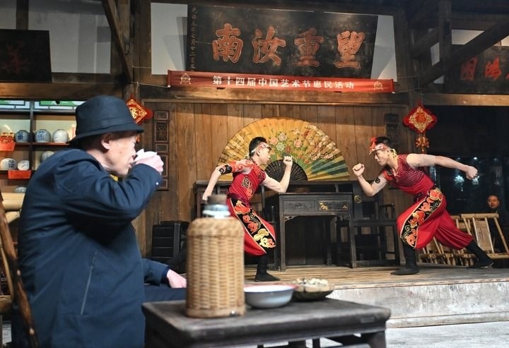 2025年10月25日,茶客在成都金琴老茶館一邊喝茶一邊觀看沈陽雜技演藝集團雜技演員表演的雜技節(jié)目《男子對手》,這是第十四屆中國藝術(shù)節(jié)惠民活動之一。新華社記者 劉坤 攝
