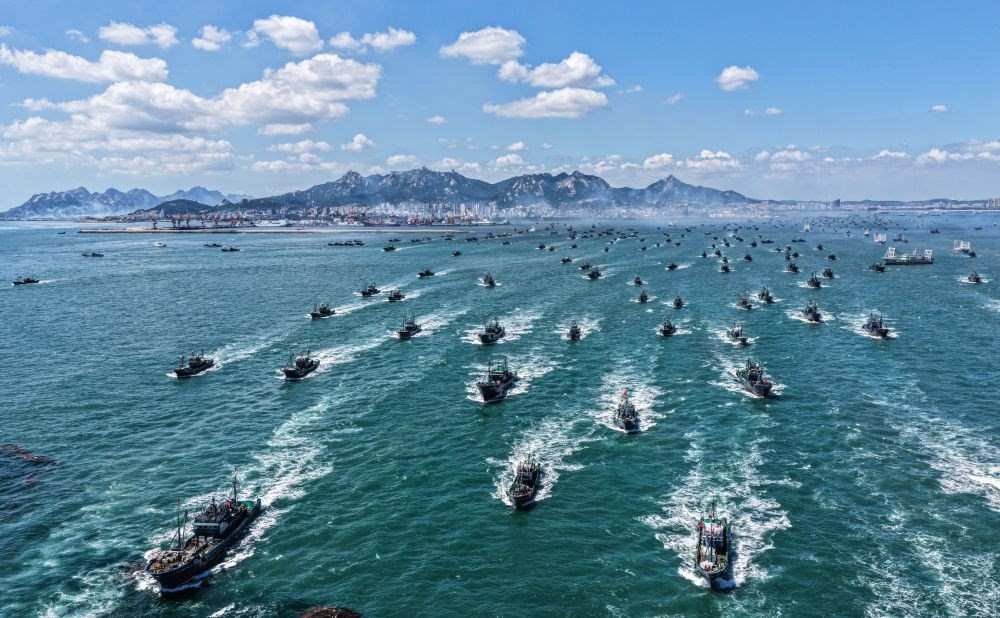 ↑ 在山東省榮成市石島漁港,黃渤海休漁期結束后,漁民駕駛漁船出海作業(yè)(9月1日攝,無人機照片)。新華社發(fā)(李信君 攝)