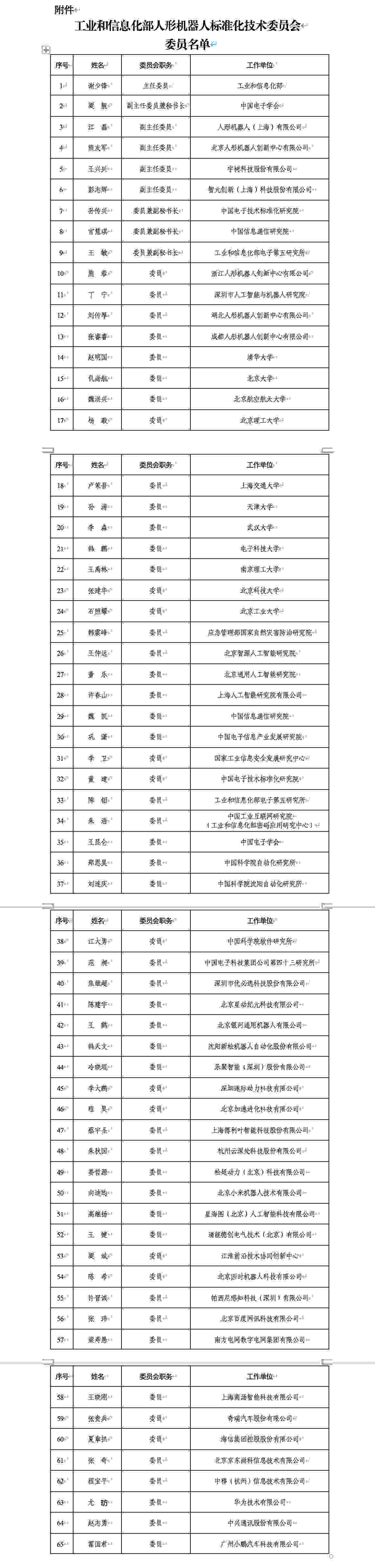 名單共包括65人,其中工業(yè)和信息化部謝少鋒為主任委員,中國(guó)電子學(xué)會(huì)梁靚為副主任委員兼秘書(shū)長(zhǎng),人形機(jī)器人(上海)有限公司江磊、北京人形機(jī)器人創(chuàng)新中心有限公司熊友軍、宇樹(shù)科技股份有限公司王興興、智元?jiǎng)?chuàng)新(上海)科技股份有限公司彭志輝為副主任委員,中國(guó)電子技術(shù)標(biāo)準(zhǔn)化研究院孫傳興、中國(guó)信息通信研究院宮慧琪、工業(yè)和信息化部電子第五研究所王敏為委員兼副秘書(shū)長(zhǎng)。