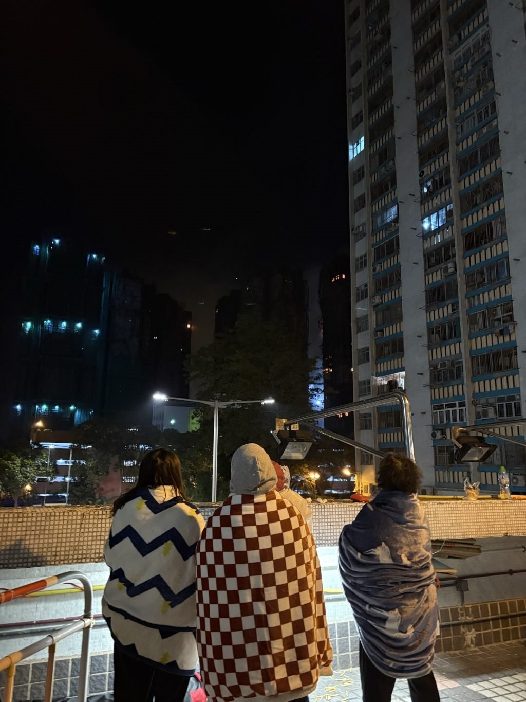 廣福商場(chǎng)二樓露天廣場(chǎng),被疏散居民裹著毛毯觀望火勢(shì)