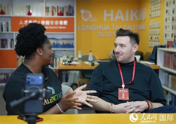 尼日利亞籍創(chuàng)業(yè)者馬爾維斯·烏福馬杜(左一)接受人民網(wǎng)外專(zhuān)柯明可采訪。人民網(wǎng)記者 符武平攝