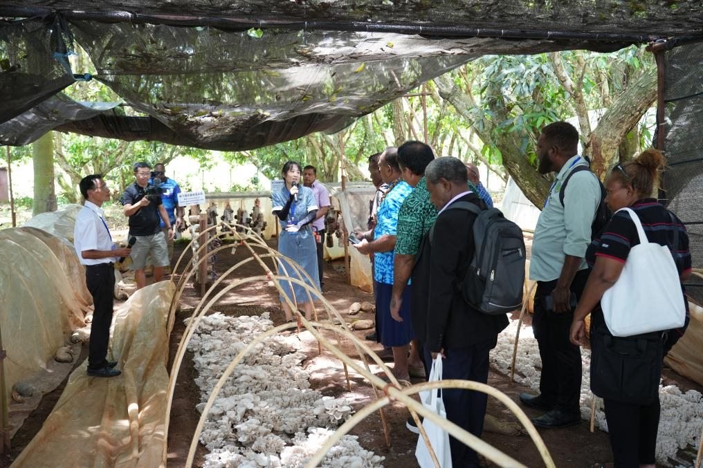 11月19日,在斐濟(jì)楠迪中國(guó)—太平洋島國(guó)菌草技術(shù)示范中心,與會(huì)代表參觀菌草菇種植示范基地。新華社發(fā)(高鑫攝)