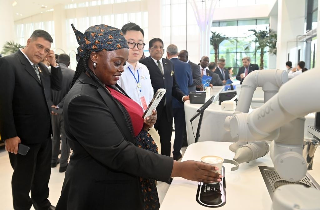 10月29日,駐華使節(jié)代表團(tuán)在中國(guó)-東盟國(guó)家人工智能應(yīng)用合作中心參觀體驗(yàn)機(jī)器人制作咖啡。新華社記者 陸波岸 攝
