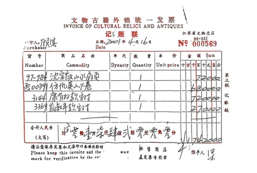 原江蘇省文物總店銷售發(fā)票顯示,《仿仇英山水卷》于2001年4月16日被“顧客”以6800元價格購買。(受訪者供圖)