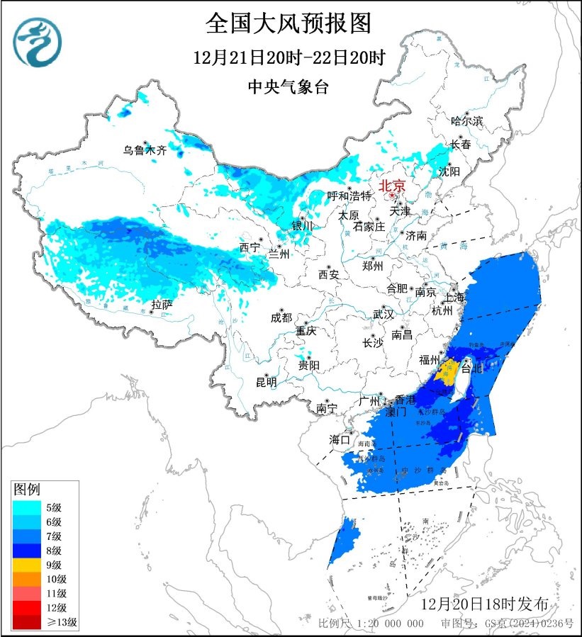 12月21日20時(shí)至22日20時(shí),內(nèi)蒙古中西部、東北地區(qū)南部、華北北部、新疆北疆東部、西藏北部、青海中南部等地有5~6級(jí)風(fēng),陣風(fēng)7~9級(jí);東海大部海域、臺(tái)灣海峽、臺(tái)灣以東洋面、巴士海峽、南海北部和中部海域?qū)⒂?~8級(jí)、陣風(fēng)9~10級(jí)的大風(fēng),其中臺(tái)灣海峽的風(fēng)力可達(dá)9級(jí)、陣風(fēng)10~11級(jí)。