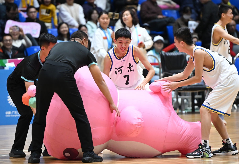 12月14日,河南隊(duì)球員在比賽間隙和吉祥物“樂(lè)融融”互動(dòng)。新華社記者 鄧華 攝