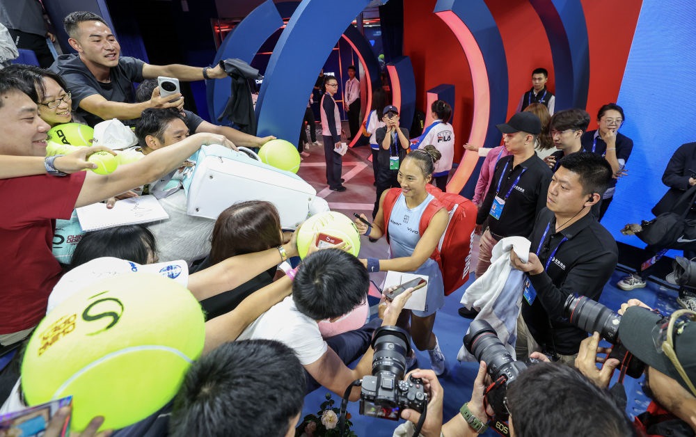 9月27日,在北京舉行的2025中國(guó)網(wǎng)球公開(kāi)賽女單第二輪與哥倫比亞選手阿朗戈的比賽后,中國(guó)選手鄭欽文(中)與觀眾互動(dòng)。新華社記者 白雪飛 攝
