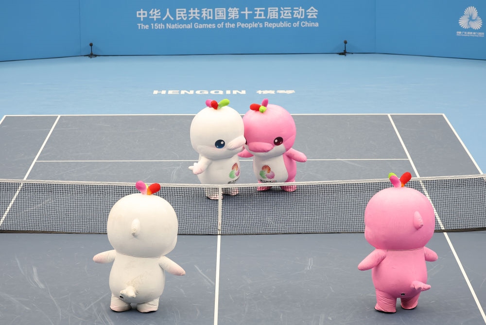 11月12日,第十五屆全國(guó)運(yùn)動(dòng)會(huì)吉祥物“喜洋洋”“樂(lè)融融”在網(wǎng)球比賽間隙表演。新華社記者 張晨霖 攝