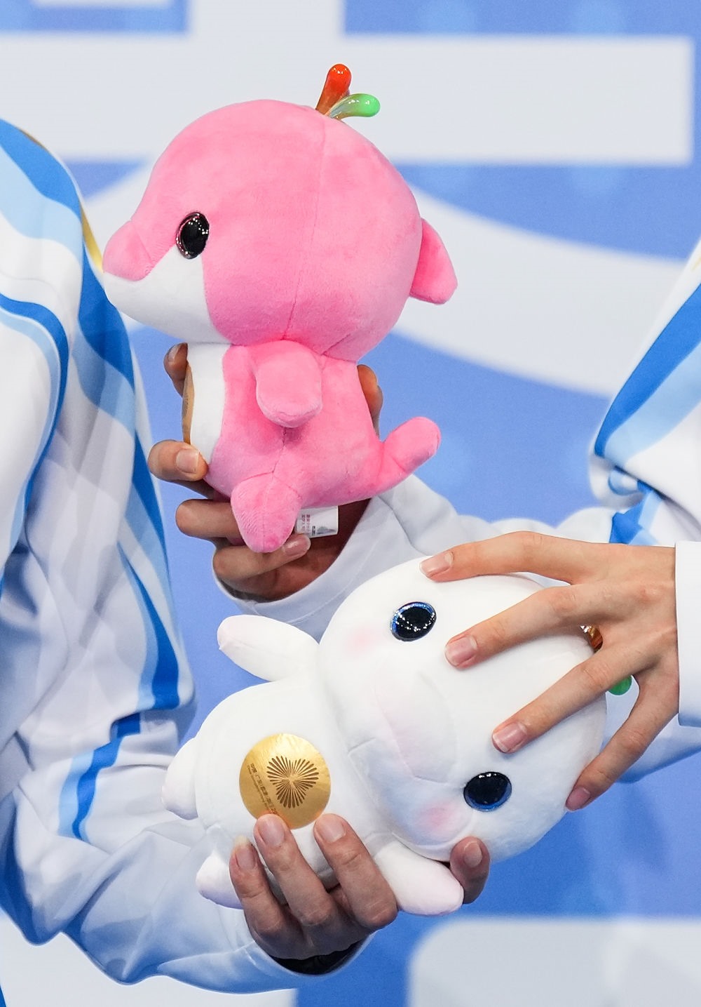 11月14日,第十五屆全國(guó)運(yùn)動(dòng)會(huì)游泳男子100米自由泳決賽在廣東省深圳市舉行,圖為冠軍浙江隊(duì)選手潘展樂(lè)和教練在頒獎(jiǎng)儀式上交換吉祥物。新華社記者 薛宇舸 攝