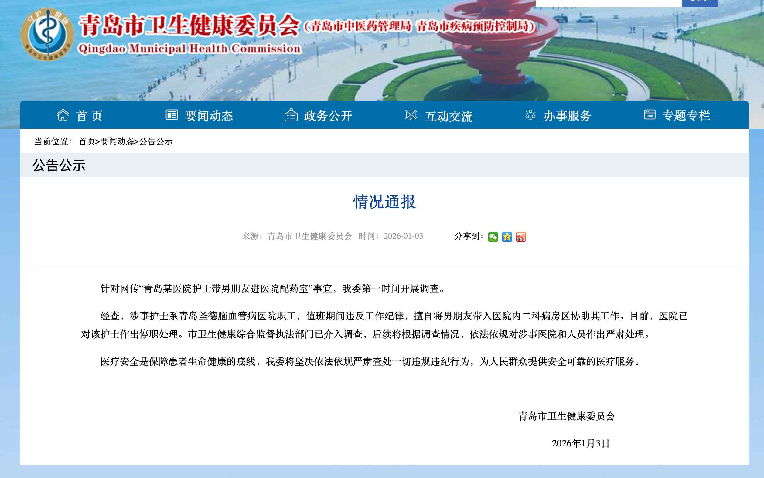 中國網(wǎng)1月3日訊 1月3日,青島市衛(wèi)生健康委員會發(fā)布情況通報:針對網(wǎng)傳“青島某醫(yī)院護(hù)士帶男朋友進(jìn)醫(yī)院配藥室”事宜,青島市衛(wèi)生健康委第一時間開展調(diào)查。