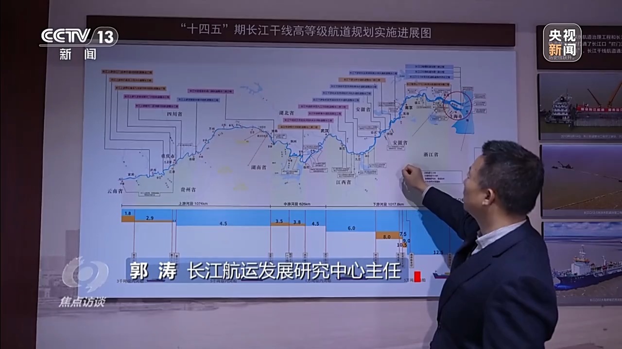 郭濤:十年前,因為局部的堵點卡點,航道標(biāo)準(zhǔn)不能統(tǒng)一,水深沒法貫通起來。通過十年的整治和疏浚,水深明顯提升了,可以通航的船舶更大了,物流成本就更低了。