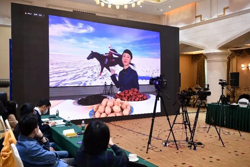 2022年3月17日,新疆維吾爾自治區(qū)人民政府在北京舉辦涉疆新聞發(fā)布會(huì),并在會(huì)上視頻連線賀嬌龍,請(qǐng)她介紹帶領(lǐng)民眾通過直播帶貨增收的情況。 中新社記者 田雨昊 攝