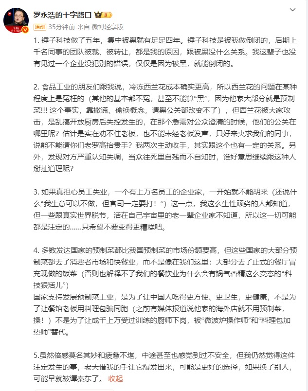 1月16日,@羅永浩的十字路口 再次發(fā)長(zhǎng)文回應(yīng)西貝賈國(guó)龍近日的言論。他表示,錘子科技做了五年,集中被黑就有足足四年。錘子科技是被我做倒閉的,后期上千名同事的團(tuán)隊(duì)被裁、被轉(zhuǎn)讓,都是我的原因,跟被黑沒(méi)什么關(guān)系。我這輩子也沒(méi)有見(jiàn)過(guò)一個(gè)企業(yè)沒(méi)犯別的錯(cuò)誤,僅僅是因?yàn)楸缓冢湍艿归]的。