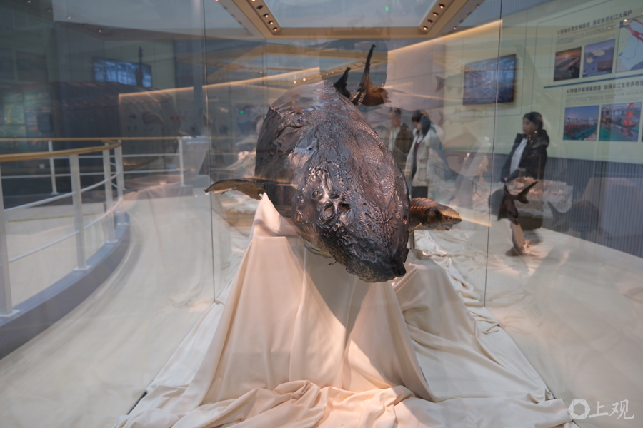 水野中心內(nèi)科普館的“鎮(zhèn)館之寶”,是一尾中華鱘標(biāo)本。它長3.5米,重350公斤。2007年7月17日在金山區(qū)杭州灣水域誤入漁網(wǎng)受傷,經(jīng)全力救治成功存活1232天,在2010年12月1日死亡,創(chuàng)下當(dāng)時國內(nèi)搶救救治中華鱘最長存活紀(jì)錄 郜陽 攝