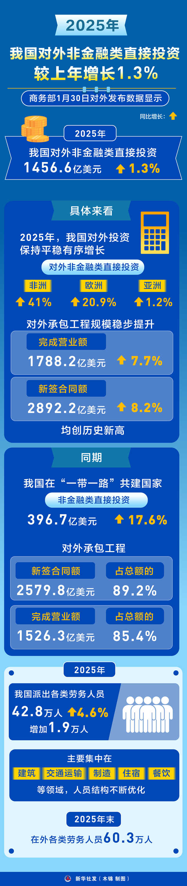 新華社北京1月30日電(記者 謝?,帲┥虅?wù)部30日對外發(fā)布數(shù)據(jù)顯示,2025年,我國對外非金融類直接投資1456.6億美元,較上年增長1.3%。