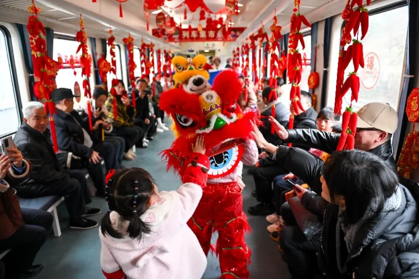 2024年2月23日,5630次列車上,旅客與舞獅互動(dòng)。當(dāng)日,在元宵節(jié)到來(lái)之際,形式多樣的鬧元宵活動(dòng)在貴州遵義開(kāi)往重慶西的5630次公益性“慢火車”上舉行,吸引不少旅客參與其中,感受濃濃節(jié)日氣氛。 中新社記者 何蓬磊 攝