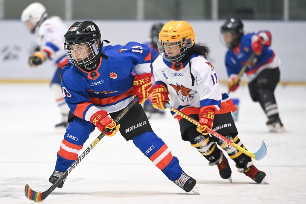 1月25日,在齊齊哈爾市的黑龍體育館內(nèi),二馬路小學(xué)翼虎冰球隊(duì)隊(duì)員劉金梓晨(左)在訓(xùn)練中。新華社記者 張濤 攝