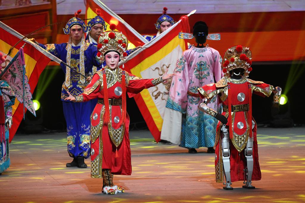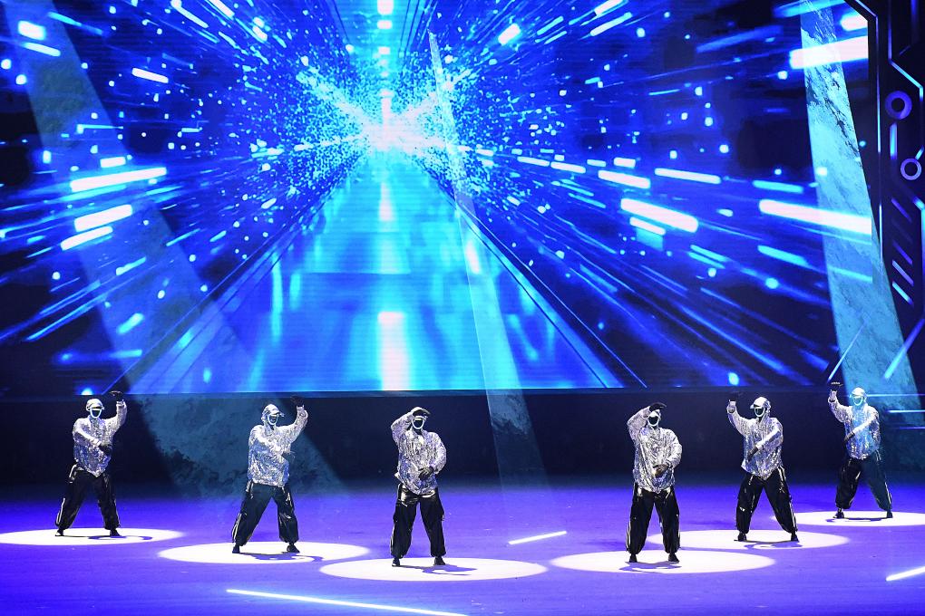在開場(chǎng)節(jié)目《萬(wàn)馬奔騰》中,20臺(tái)機(jī)械臂與26臺(tái)雙臂機(jī)器人齊揮鼓槌,激昂鼓聲奏出奮進(jìn)節(jié)拍。