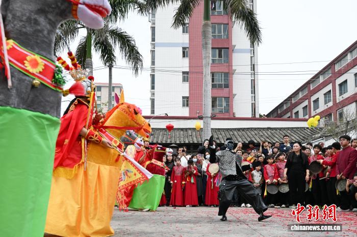 2月24日,廣東省潮州市田頭何村開(kāi)展民俗巡游活動(dòng),機(jī)器人與布馬舞舞者共舞,吸引村民觀看。中新社記者 陳楚紅 攝