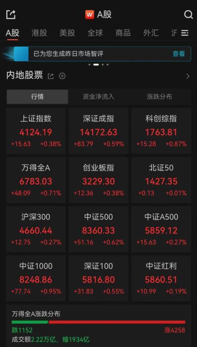 全市成交額2.22萬億,超4200只個(gè)股上漲。