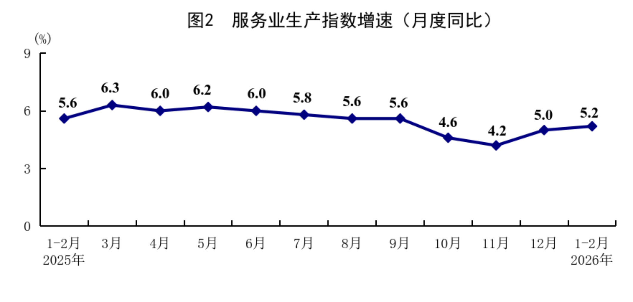 1—2月份,全國服務業(yè)生產指數(shù)同比增長5.2%,比上年12月份加快0.2個百分點。分行業(yè)看,信息傳輸、軟件和信息技術服務業(yè),租賃和商務服務業(yè),金融業(yè),交通運輸、倉儲和郵政業(yè),住宿和餐飲業(yè)生產指數(shù)分別增長10.1%、8.2%、7.0%、6.3%、5.4%。2月份,服務業(yè)商務活動指數(shù)為49.7%,比上月上升0.2個百分點;服務業(yè)業(yè)務活動預期指數(shù)為55.8%。其中,住宿、餐飲、文化體育娛樂等行業(yè)商務活動指數(shù)位于60.0%以上高位景氣區(qū)間。