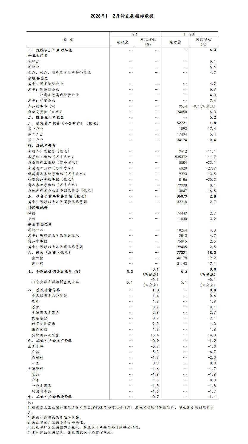 中國網3月16日訊 國家統(tǒng)計局網站3月16日發(fā)布消息,1—2月份,在以習近平同志為核心的黨中央堅強領導下,各地區(qū)各部門認真落實黨中央、國務院決策部署,堅持穩(wěn)中求進工作總基調,實施更加積極有為的宏觀政策,加大逆周期和跨周期調節(jié),持續(xù)擴大內需、優(yōu)化供給,做優(yōu)增量、盤活存量,生產供給增長加快,市場需求穩(wěn)中有升,就業(yè)物價總體穩(wěn)定,新質生產力成長壯大,經濟運行起步有力,實現(xiàn)良好開局。