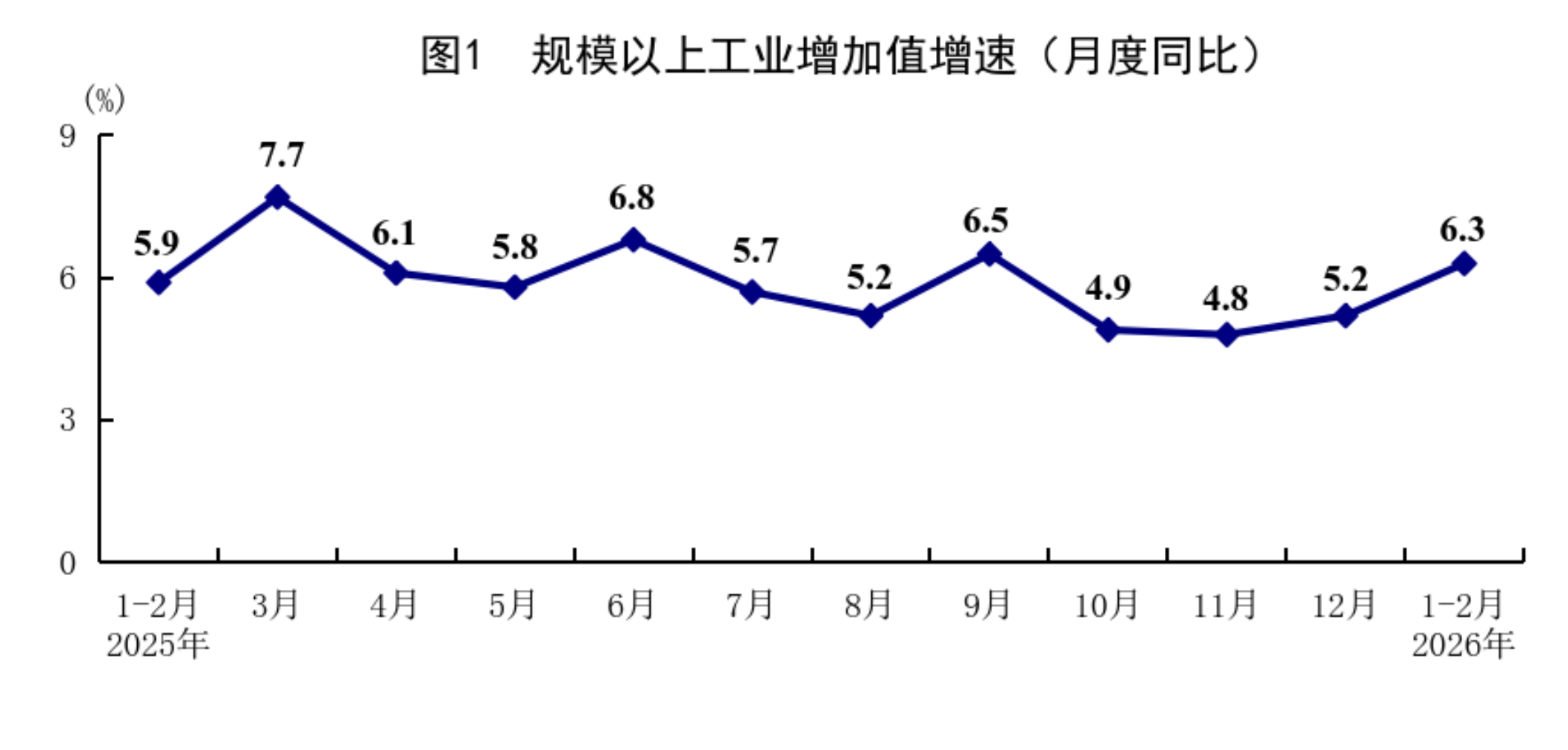 1—2月份,全國規(guī)模以上工業(yè)增加值同比增長6.3%,比上年12月份加快1.1個百分點。分三大門類看,采礦業(yè)增加值同比增長6.1%,制造業(yè)增長6.6%,電力、熱力、燃氣及水生產和供應業(yè)增長4.7%。裝備制造業(yè)增加值同比增長9.3%,高技術制造業(yè)增加值增長13.1%,分別快于全部規(guī)模以上工業(yè)增加值3.0和6.8個百分點。分經濟類型看,國有控股企業(yè)增加值同比增長4.2%;股份制企業(yè)增長6.9%,外商及港澳臺投資企業(yè)增長4.0%;私營企業(yè)增長7.4%。分產品看,3D打印設備、鋰離子電池、工業(yè)機器人產品產量同比分別增長54.1%、42.6%、31.1%。從環(huán)比看,2月份規(guī)模以上工業(yè)增加值比上月增長0.83%。2月份,制造業(yè)采購經理指數(shù)為49.0%;企業(yè)生產經營活動預期指數(shù)為53.2%,比上月上升0.6個百分點。