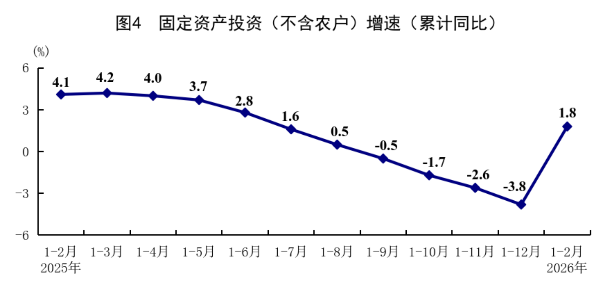 1—2月份,全國固定資產投資(不含農戶)52721億元,同比增長1.8%,上年全年為下降3.8%;扣除房地產開發(fā)投資,全國固定資產投資增長5.2%。分領域看,基礎設施投資同比增長11.4%,制造業(yè)投資增長3.1%,房地產開發(fā)投資下降11.1%。全國新建商品房銷售面積9293萬平方米,同比下降13.5%;新建商品房銷售額8186億元,下降20.2%。分產業(yè)看,第一產業(yè)投資同比增長17.4%,第二產業(yè)投資增長5.4%,第三產業(yè)投資下降0.4%。民間投資同比下降2.6%,降幅比上年全年收窄3.8個百分點;扣除房地產開發(fā)投資,民間投資增長1.0%。高技術產業(yè)投資同比增長5.1%,其中航空、航天器及設備制造業(yè),研發(fā)與設計服務業(yè),信息服務業(yè)投資分別增長20.2%、20.6%、16.5%。從環(huán)比看,2月份固定資產投資(不含農戶)比上月增長0.39%。