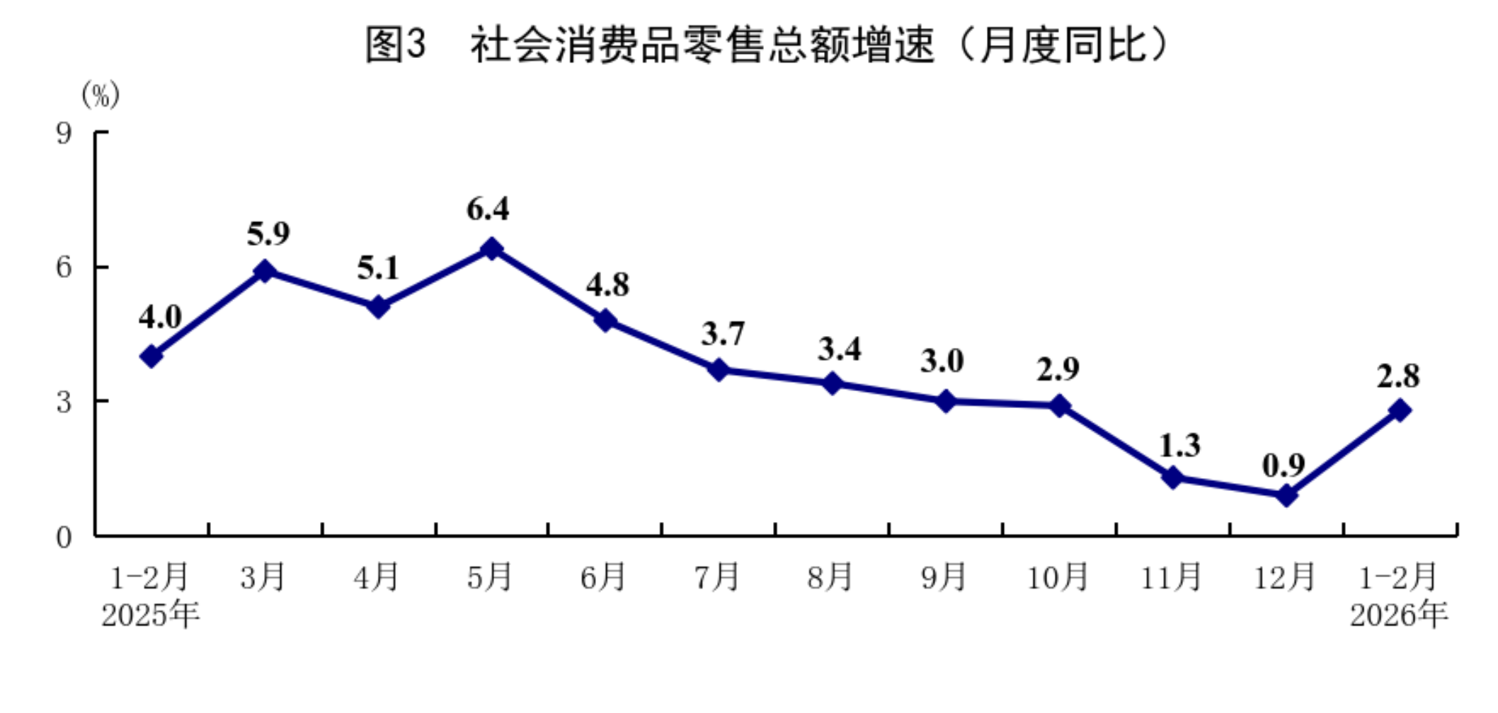 1—2月份,社會消費品零售總額86079億元,同比增長2.8%,比上年12月份加快1.9個百分點。按經營單位所在地分,城鎮(zhèn)消費品零售額74449億元,增長2.7%;鄉(xiāng)村消費品零售額11630億元,增長3.2%。按消費類型分,商品零售額75815億元,增長2.5%;餐飲收入10264億元,增長4.8%?;旧铑惡筒糠稚夘惿唐蜂N售增長較快。限額以上單位服裝鞋帽針紡織品類、糧油食品類、通訊器材類、金銀珠寶類商品零售額同比分別增長10.4%、10.2%、17.8%、13.0%。從環(huán)比看,2月份社會消費品零售總額比上月增長0.81%。1—2月份,服務零售額同比增長5.6%,比上年全年加快0.1個百分點。其中,通訊信息服務類、旅游咨詢租賃服務類、文體休閑服務類零售額較快增長。1—2月份,全國網上商品和服務零售額32546億元,同比增長9.2%。其中,網上商品零售額20812億元,增長10.3%,占社會消費品零售總額的比重為24.2%;網上服務零售額11734億元,增長7.3%。