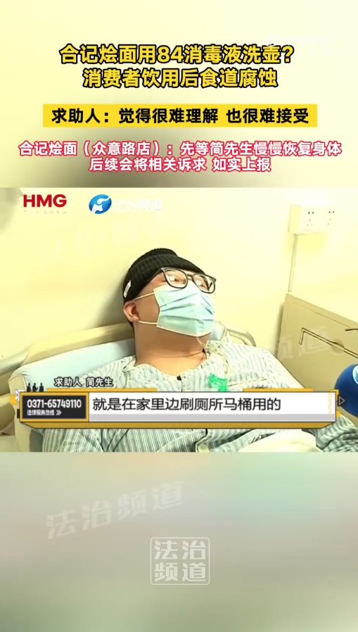 中新網(wǎng)北京3月16日電(記者 劉星晨)“現(xiàn)在胃和食道還覺得疼,吃東西以流食和半流食為主,吞咽饅頭這種會有困難?!痹诤喯壬闹v述里,由于在鄭州合記燴面眾意路店用餐期間喝到了含有84消毒液的水,他過去三個月一度瘦了30斤。
