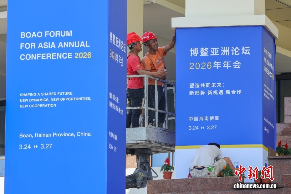 3月17日,博鰲亞洲論壇2026年年會(huì)各項(xiàng)籌備工作正有序推進(jìn),海南博鰲街頭的盛會(huì)氛圍日漸濃厚。以“塑造共同未來(lái):新形勢(shì)、新機(jī)遇、新合作”為主題的博鰲亞洲論壇2026年年會(huì)將于3月24日至27日在海南博鰲召開(kāi)。圖為工作人員在博鰲亞洲論壇永久會(huì)址安裝年會(huì)主題展板。中新社記者 駱云飛 攝