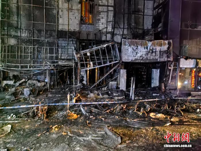 29日1時許,起火建筑物東側(cè)樓體外墻可見大面積燃燒痕跡,緊鄰?fù)ǖ赖膸组g門面房過火,受損嚴(yán)重。門面房前邊有多輛電動自行車被燒成鐵架子。