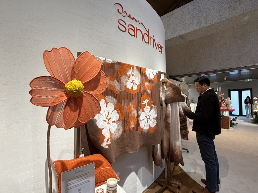 “踏花影”區(qū)域是一個五感體驗的沉浸空間。藝術(shù)羊絨品牌Sandriver沙涓現(xiàn)場還原了日喀則羊絨氆氌工坊、果洛牦牛絨氆氌工坊的織機操作,匠人以雙手穿梭,在經(jīng)緯交錯間演繹“高原的溫度”,消費者能近距離觀看從捻紗到成胚的全過程,感受這一非物質(zhì)文化遺產(chǎn)的匠心精神。沙涓品牌負責人介紹,品牌將首發(fā)羊絨睡袍系列新品、馬年主題哈尼繡系列以及羊絨艾德萊斯家居毯等作品,展現(xiàn)傳統(tǒng)工藝與當代生活美學融合的羊絨設(shè)計。