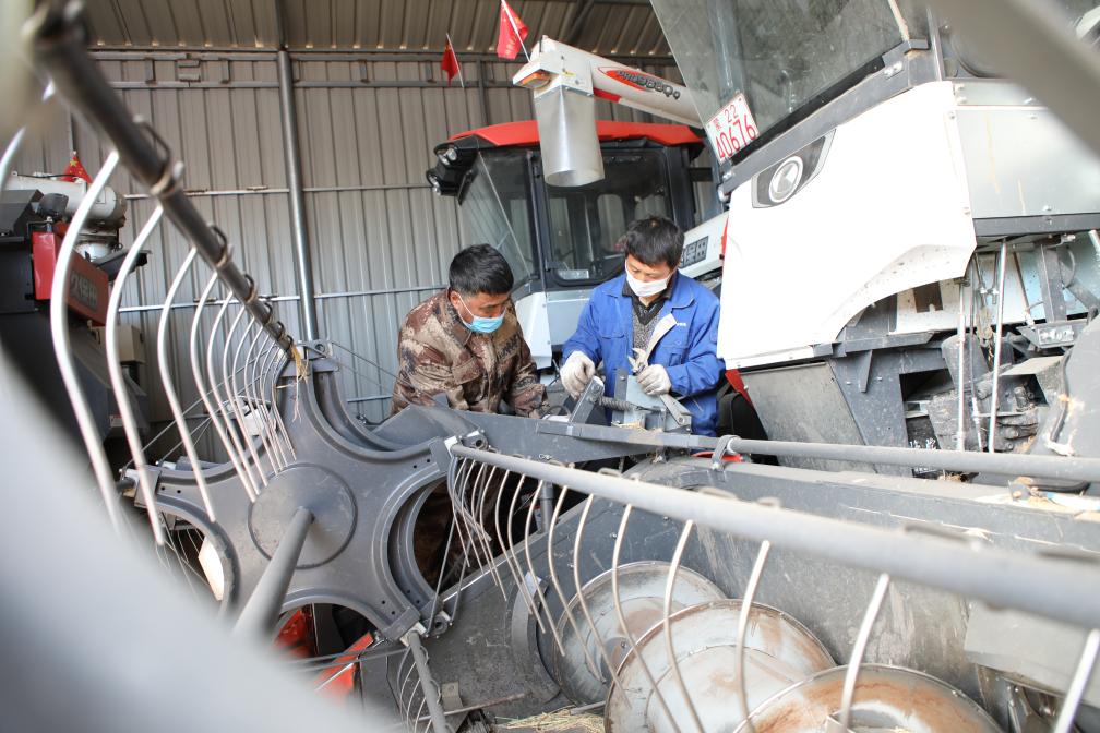 在科爾沁右翼前旗,工作人員正在檢修農(nóng)機(jī)。(時(shí)秀霞 攝)