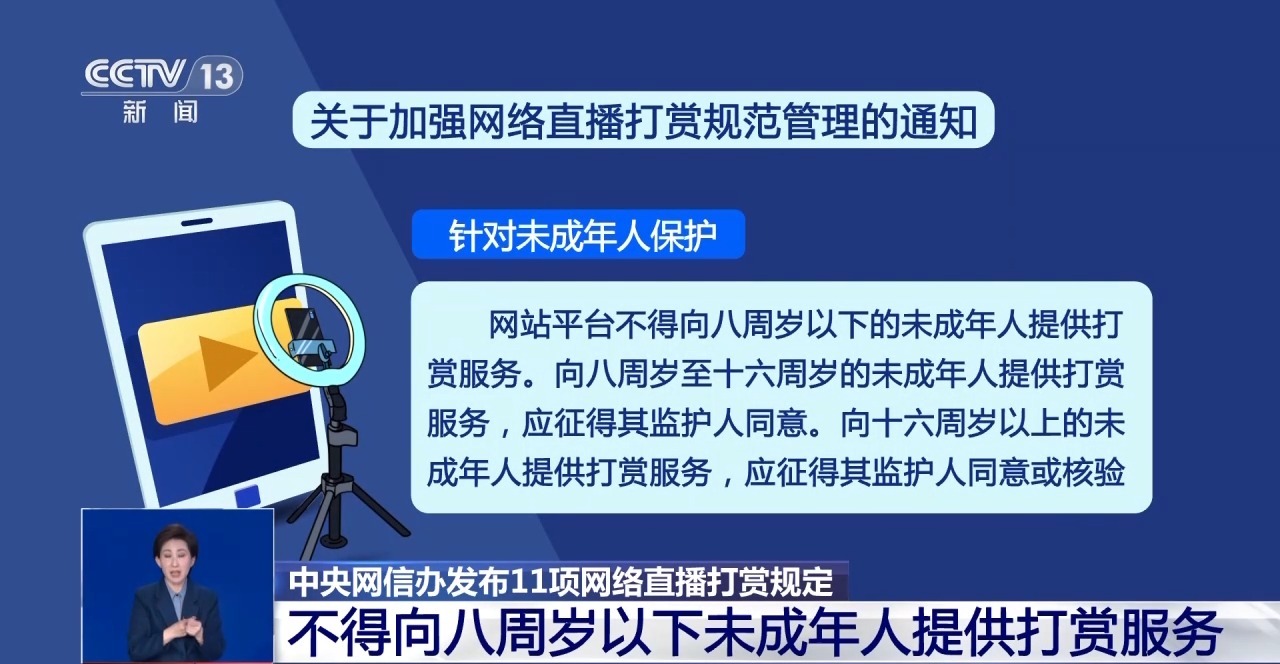 據(jù)記者了解,“通知”中提出11項(xiàng)具體要求,包括:明示打賞規(guī)則、規(guī)范打賞營(yíng)利權(quán)限開(kāi)通、完善未成年人保護(hù)機(jī)制、建立打賞營(yíng)利行為負(fù)面清單、加大處置和曝光力度等。
