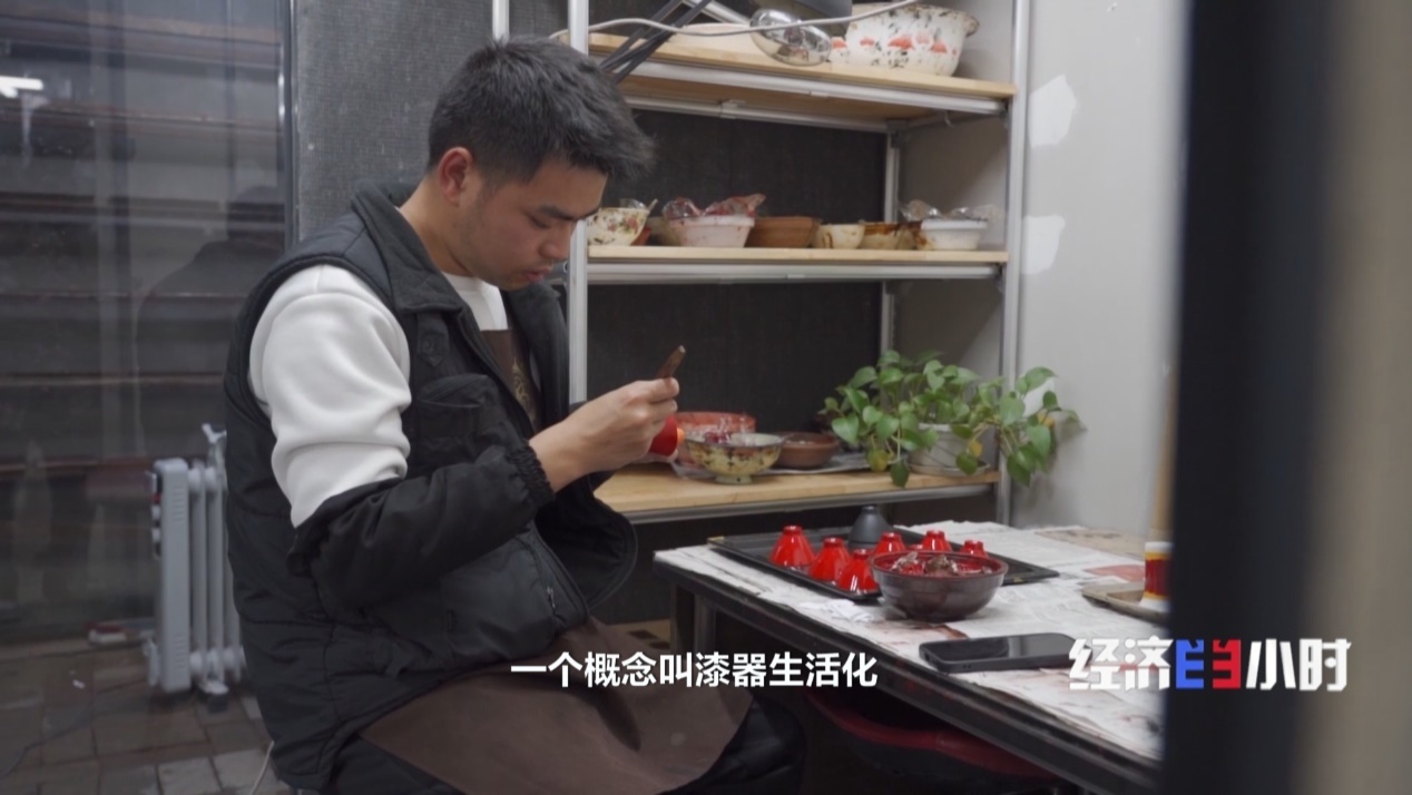 這個開設(shè)在茶館里的漆器文創(chuàng)店,獨(dú)特之處在于采購體驗于一體。漆器不再被鎖進(jìn)玻璃柜,而是被放置在茶桌旁、展示架上。消費(fèi)者可以上手體驗簡單的打磨工序。