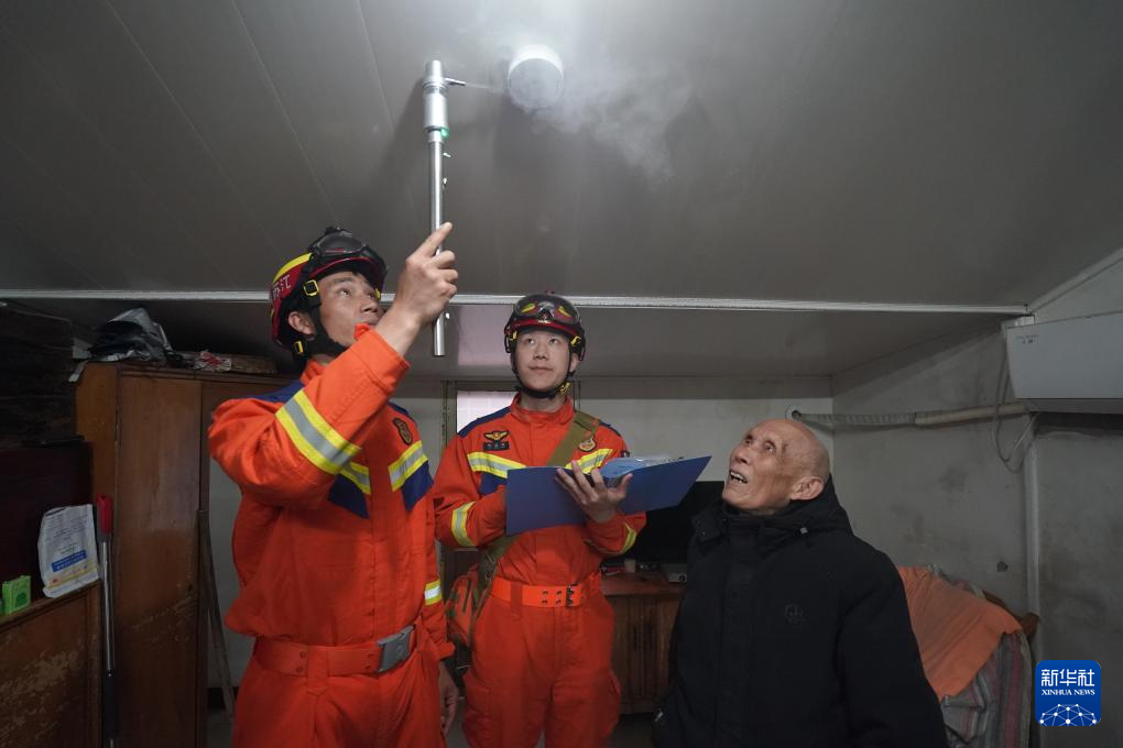 在東關(guān)街羊巷周福喜(右)老人家中,“協(xié)同治理合伙人”消防救援局東關(guān)街政府專職消防隊(duì)隊(duì)員檢測并記錄煙感報(bào)警器運(yùn)行情況(4月16日攝)。