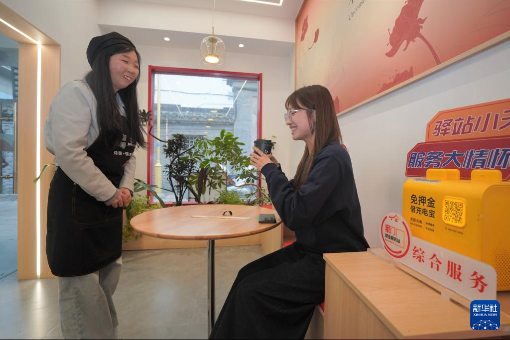 在揚(yáng)州市廣陵區(qū)東關(guān)街道瓊花觀社區(qū)游客服務(wù)中心,“公益服務(wù)合伙人”黃智玥(左)為游客送上咖啡(4月16日攝)。