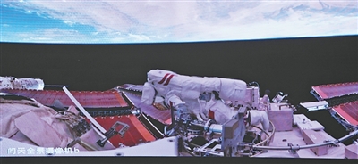 在北京航天飛行控制中心屏幕上拍攝的陳中瑞在空間站組合體艙外工作畫面。新華社記者 厲彥辰攝