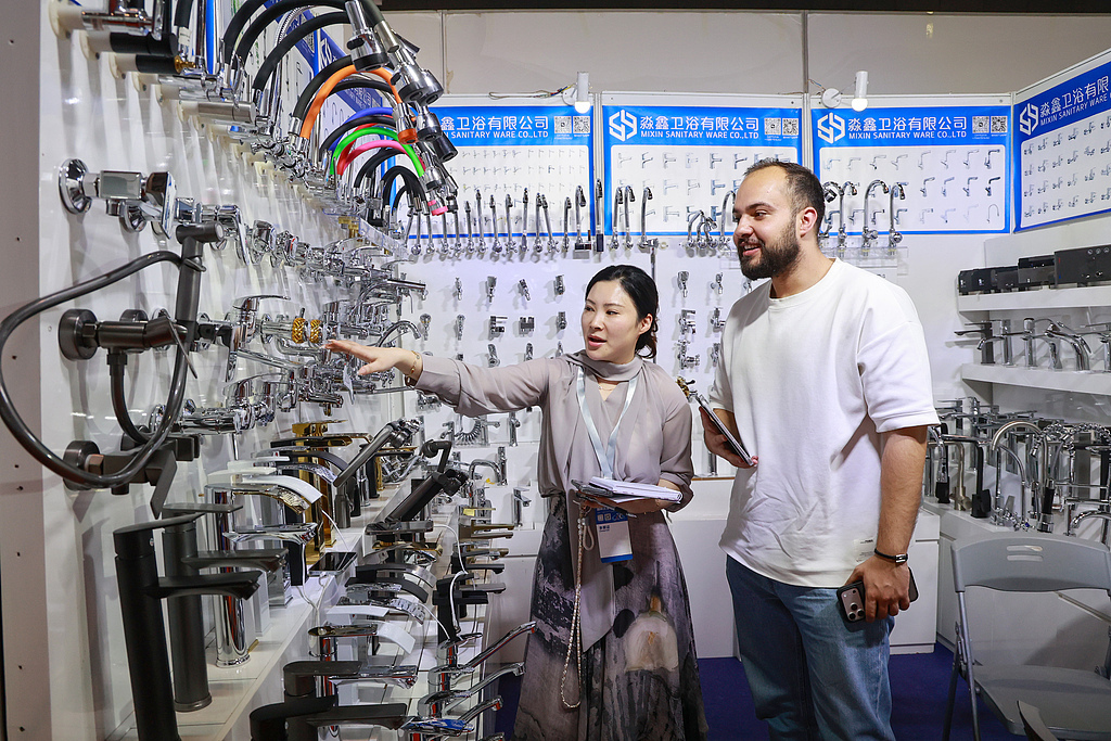 4月20日,外商在第10屆中國(guó)義烏國(guó)際五金電器博覽會(huì)上采購(gòu)配件。