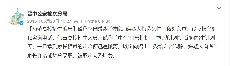 每年各省市投檔分數(shù)線公布后,總是“幾家歡喜幾家愁”,不法分子也在此刻瞄準了落榜考生。根據(jù)各地公安部門通報,一些不法分子假冒高校招生人員或聲稱“熟悉”高校招生辦,點對點與相關考生取得聯(lián)系。隨后謊稱有某高校的“內部指標”“機動計劃”,或是以“定向招生”“委培招生”等名義“降分錄取”考生,誘騙其繳納相關費用。需要注意的是,在實施這些詐騙行為時,不法分子往往使用電腦合成技術偽造“招生文件”“學校公章”等,騙取考生及家長的信任。